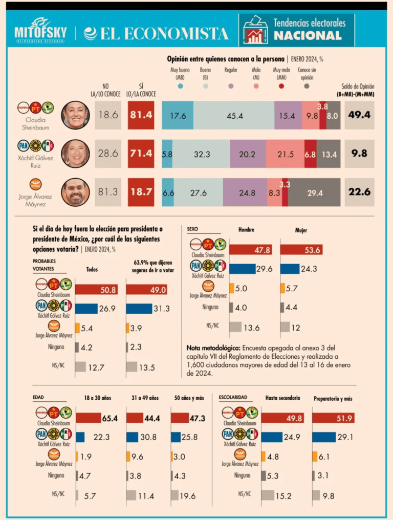 La encuesta se llevó a cabo del 13 al 16 de enero de 2024 a mil 600 ciudadanos mayores de 18 años residentes en el país con credencial para votar, en una entrevista cara a cara. Tiene un nivel de confianza del 95% con un márgen de error del ±2.5%.