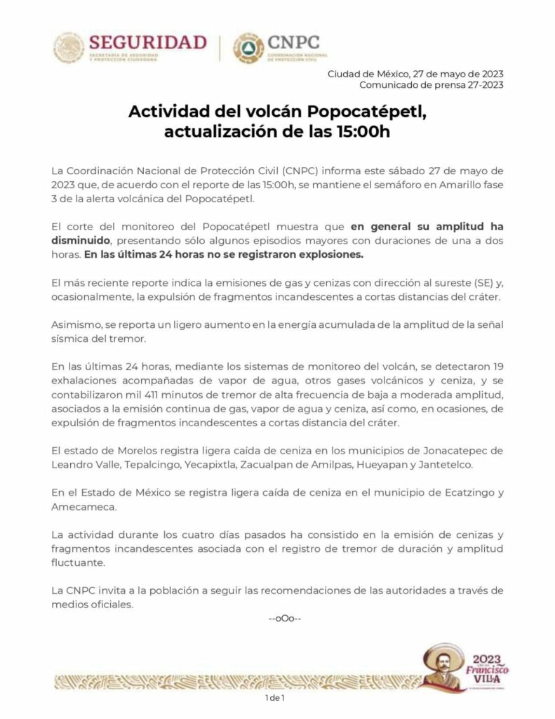 La Coordinación Nacional de Protección Civil (CNPC) anunció que el semáforo de alerta volcánica del Popocatépetl se mantiene en Amarillo fase 3. El corte del monitoreo mostró que en general la amplitud del volcán ha disminuido, presentando solo algunos episodios mayores con duraciones de una o dos horas.