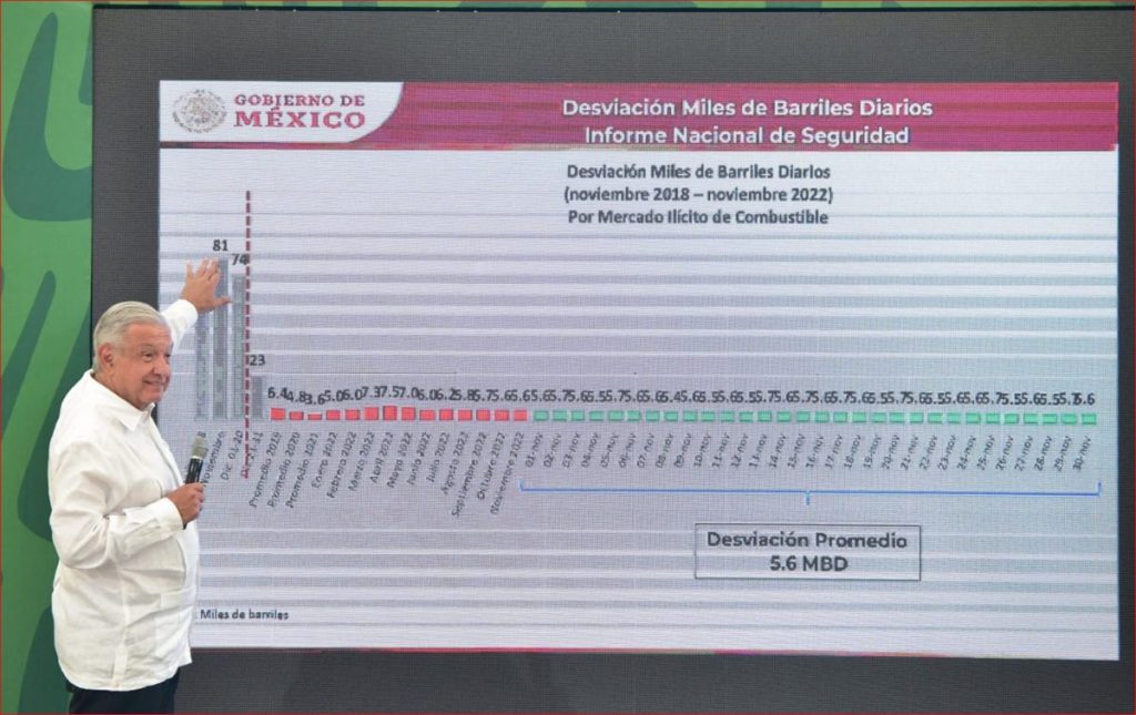 El ahorro por la reducción de este ilícito, del 1 de diciembre de 2018 al 30 de septiembre de 2022, asciende a 231 mil 27 millones 143 mil 100 pesos, lo que equivale a 165 millones 19 mil 387 pesos diarios, puntualizó el mandatario.