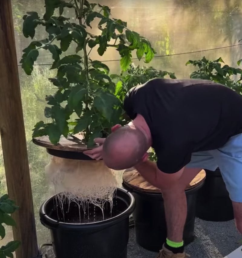 La segunda técnica implicaba usar una canasta de malla de 150 mm llena de bolas de arcilla y colocarla en un agujero hecho en la tapa del contenedor. En ambos métodos, las plantas de tomate se plantaron directamente en los orificios de la tapa.