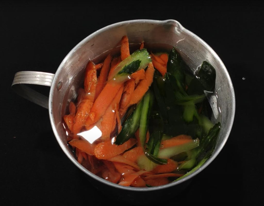 Posteriormente, cuando se haya acumulado una cantidad suficiente, se colocan los desechos en una olla, se cubren con agua y se hierven durante 5 minutos. Una vez hervida la mezcla, se deja enfriar hasta llegar a temperatura ambiente y luego se cuela para separar el agua de los desechos.