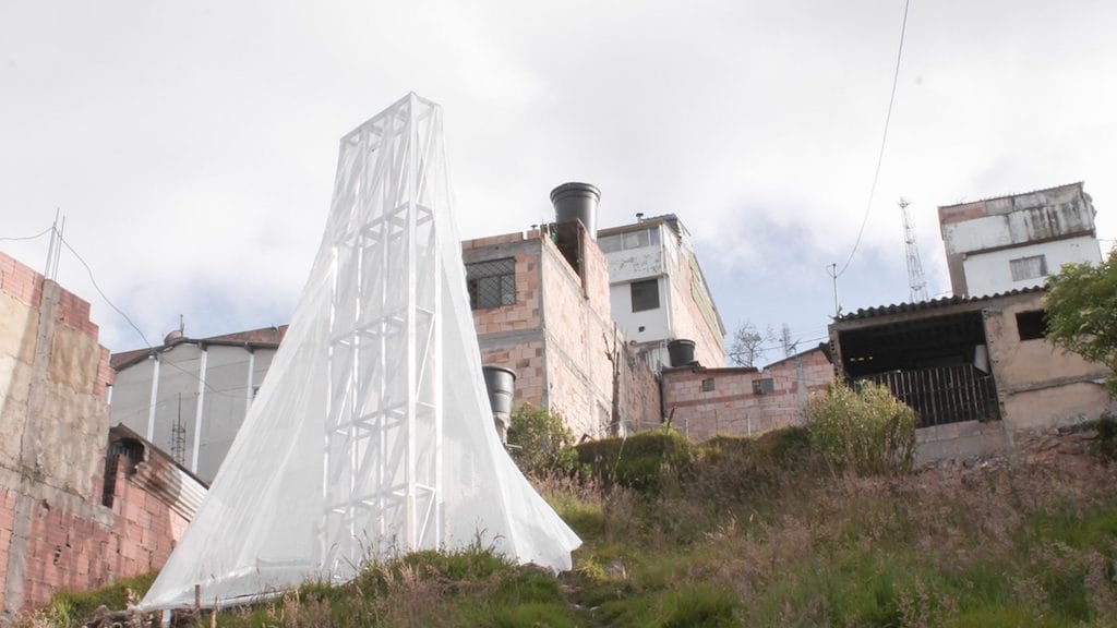 El estudio de diseño Alsar Atelier y el diseñador Oscar Zamora han desarrollado una estructura en Bogotá, Colombia, capaz de recolectar 200 litros de agua por semana para la comunidad local, utilizando una sencilla estructura cubierta de tela.
