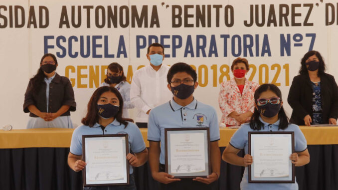 Luego de esto, se dio paso a la entrega de diplomas correspondiente a 305 bachilleres que concluyeron el Nivel Medio Superior y se dieron reconocimientos a quienes obtuvieron los mejores promedios: Laila Yareth Aquino Díaz, Giovanni Alexis Santiago Ramírez, Carol Concepción Ruiz González.