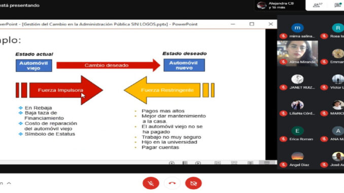 Como parte del taller de la Gestión del Cambio en la Administración Pública, las servidoras y servidores públicos aprendieron sobre los roles en el equipo de trabajo, desarrollo del pensamiento sistemático, fase introductoria del ciclo del cambio y sus ocho fases, así como modelos del cambio organizacionales.