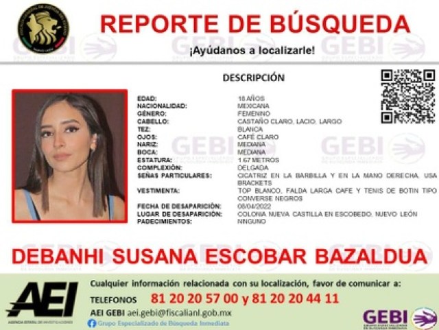 La Fiscalía proporcionó los teléfonos 81 20 20 57 00 y 81 20 20 44 11 para comunicarse si la han visto o tiene información sobre su paradero.