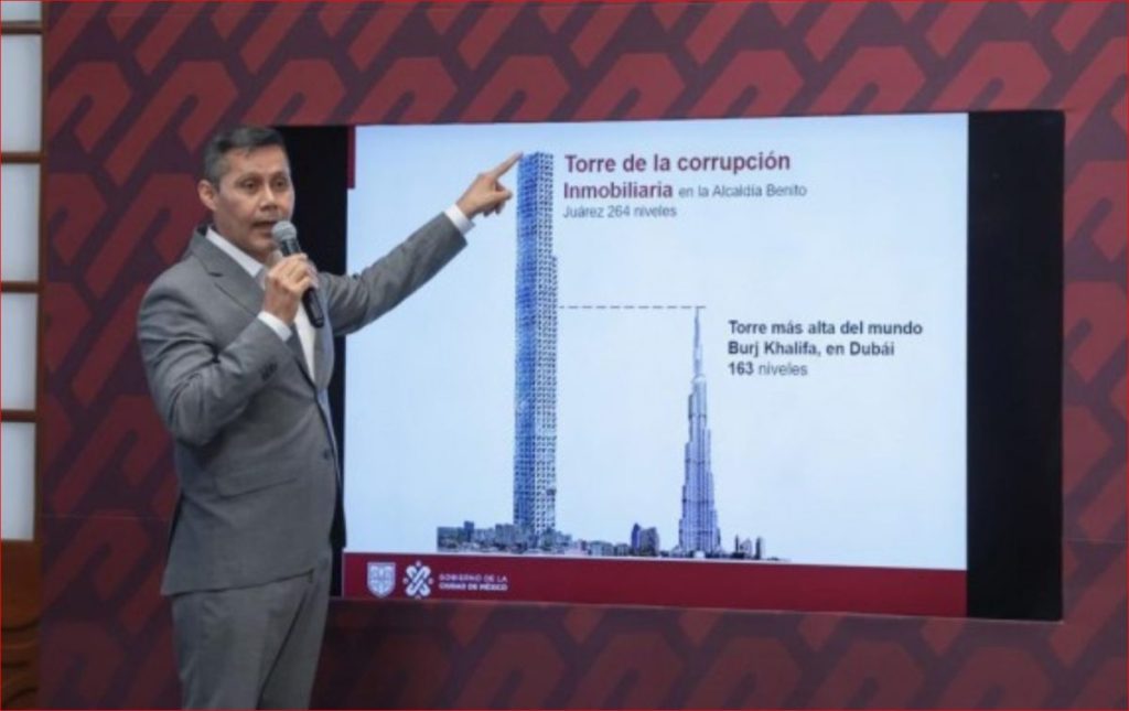 El secretario de Desarrollo Urbano y Vivienda, Carlos Alberto Ulloa Pérez, comparó estos 264 pisos excedentes y construidos al amparo de la corrupción en Benito Juárez con el edificio más grande del mundo, el Burj Khalifa, que se encuentra en Dubái y que cuenta solo con 163 niveles.