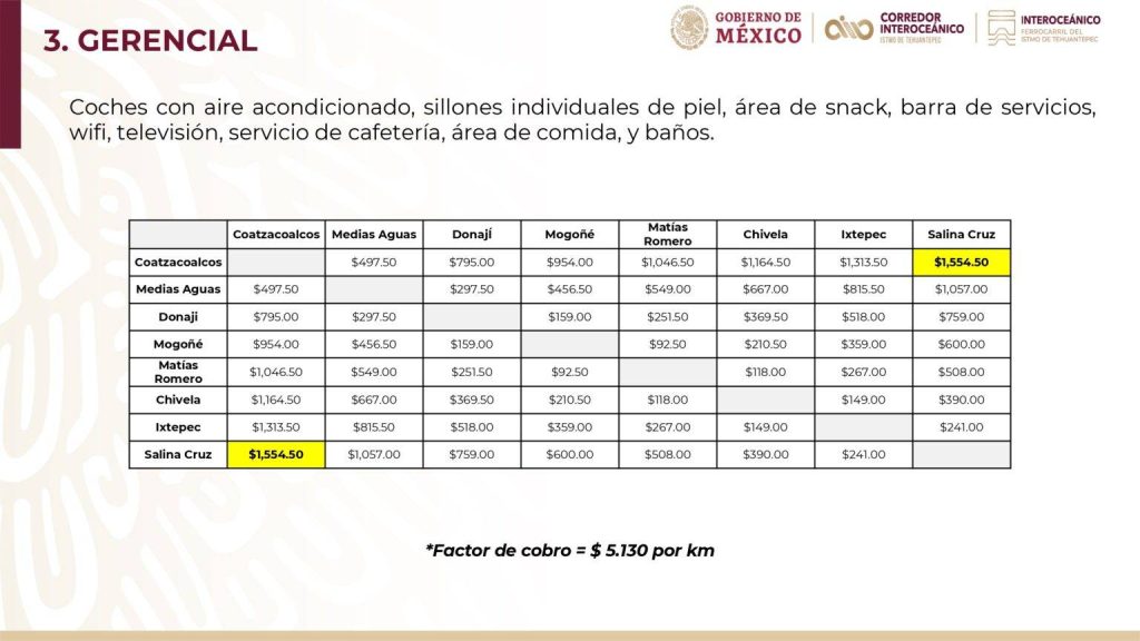 Este, se indica, costará mil 554.50 pesos desde Salina Cruz a Coatzacoalcos; el factor de cobro es de 5.13 pesos por kilómetro.