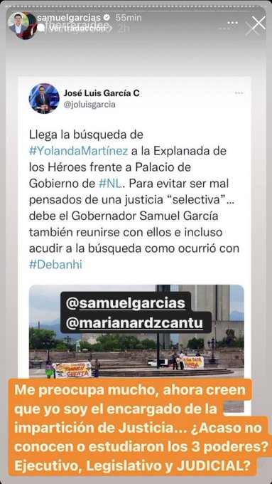 Me preocupa mucho, ahora creen que yo soy el encargado de la impartición de Justicia… ¿Acaso no conocen o estudiaron los tres poderes? Ejecutivo, Legislativo y JUDICIAL”, se lee en una historia del mandatario que compartió en Instagram.