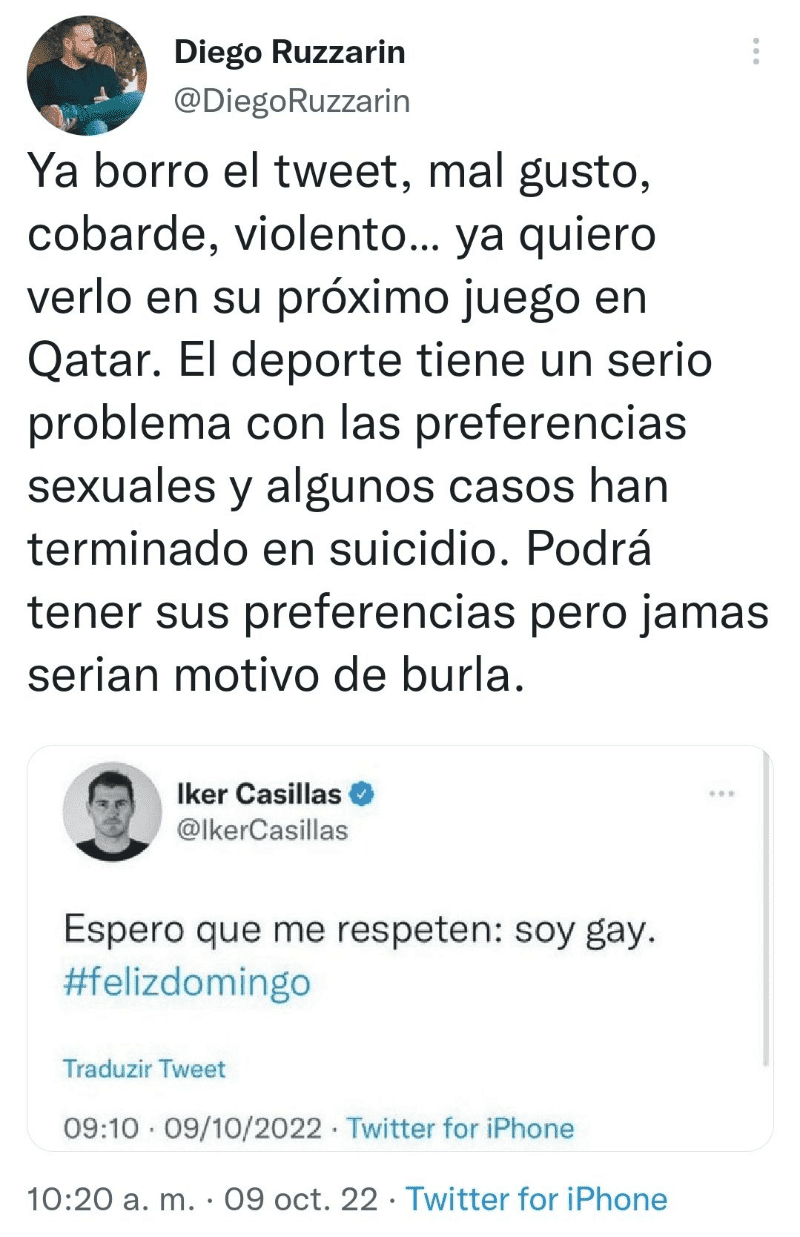 Diego Ruzzarin, luego de que Iker Casillas eliminara la publicación, escribió: «Ya borró el tweet, mal gusto, cobarde, violento… ya quiero verlo en su próximo juego en Qatar. El deporte tiene un serio problema con las preferencias sexuales y algunos casos han terminado en suicidio. Podrá tener sus preferencias pero jamás serian motivo de burla (sic)».