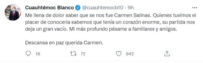 «Me llena de dolor saber que se nos fue Carmen Salinas. Quienes tuvimos el placer de conocerla sabemos que tenía un corazón enorme, su partida nos deja un gran vacío», escribió el exfutbolista en su cuenta de Twitter.