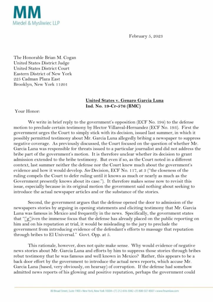 La carta enviada al juez federal Brian Cogan fechada este domingo 5 de febrero, argumenta que los fiscales tienen la intención de presentar testimonio sobre el aparente pago de sobornos al periódico El Universal por parte de García Luna para frenar la publicación de notas adversas a su reputación. Más aún, los fiscales buscarán “introducir evidencia de los esfuerzos del acusado para masajear (sic) esa reputación a través de sobornos a El Universal”.