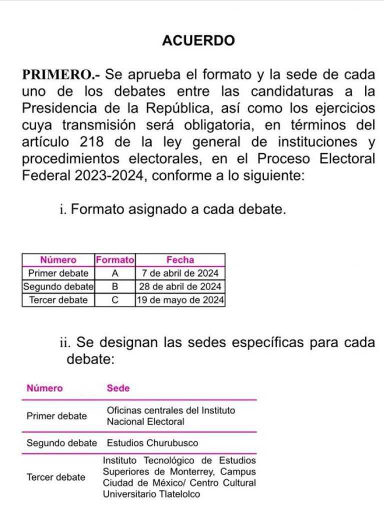 La Comisión Temporal de Debates del Instituto Nacional Electoral (INE) aprobó el anteproyecto que define las sedes y formatos donde se realizarán los tres debates de los candidatos a la Presidencia de México.