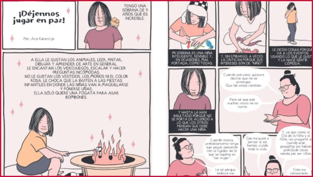 Mediante la historia de su sobrina de 9 años, nos recuerda cómo, desde niñas, las mujeres somos condicionadas a seguir determinados comportamientos. Nuestros intereses y aficiones están siempre supeditadas a lo que se supone debe ser “Lo femenino”.