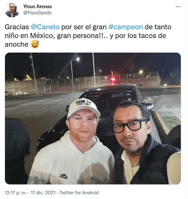 En redes sociales comenzó a circular una imagen donde el usuario @YisusSands le agradece al boxeador por la foto que se tomó con él a la salida del establecimiento, y por invitar los tacos.