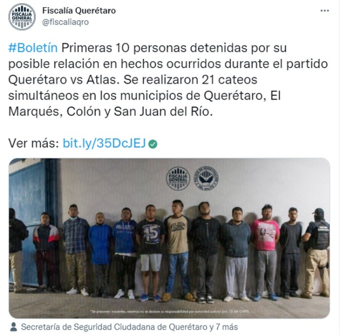 La Fiscalía de Querétaro informó que en continuidad con la investigación ininterrumpidas que se han realizado por la carpeta de investigación que se abrió tras las denuncias recibidas por los actos de violencia del pasado sábado 5 de marzo en el partido Querétaro vs Atlas en el Estadio La Corregidora, se han detenido a las primeras 10 personas, todas ellas del sexo masculino. Además, se dio cumplimiento a 21 órdenes de cateo otorgadas por el Juez de Control del Poder Judicial.