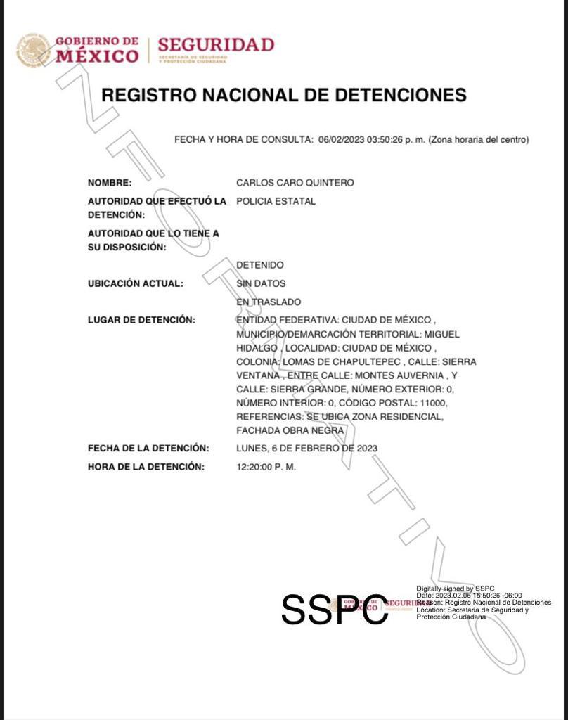 Según el Registro Nacional de Detenciones, Carlos Caro Quintero, fue detenido por la policía capitalina en la calle Sierra Ventana, en una casa en obra negra.