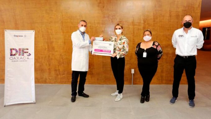 En el marco del mes de la sensibilización sobre el cáncer de mama y continuando con las gestiones en beneficio de la salud de las oaxaqueñas en las 8 regiones del estado, la presidenta honoraria del Sistema para el Desarrollo Integral de la Familia (DIF) Oaxaca, Ivette Morán de Murat, entregó un donativo de 50 mil pesos a la Fundación de Cáncer de Mama (FUCAM) A.C.