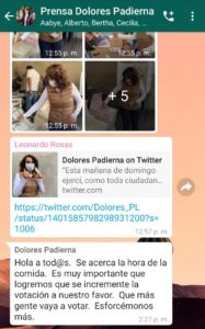 Hacia la una de la tarde, llegó al chat de Whatsapp de los periodistas que cubren la candidatura de la diputada con licencia un mensaje proveniente del número de ella, en el que pedía realizar un mayor esfuerzo por convencer a la gente a acudir a las urnas, pues necesitaban levantar sus números a medida que se acercaba la hora de la comida.