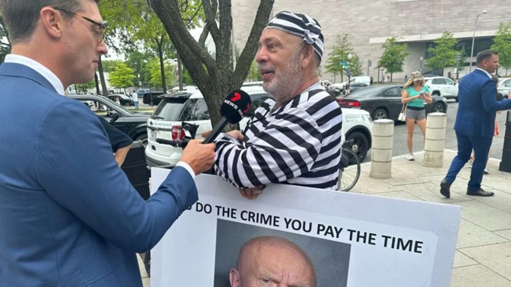 Vestido con un traje de preso, un hombre defendió tanto en inglés como en español por qué cree que Trump debe ir a prisión. Se trata de un cubano-americano, que aseguró ser afín al Partido Republicano, pero que debió votar por el demócrata Joe Biden en 2020.