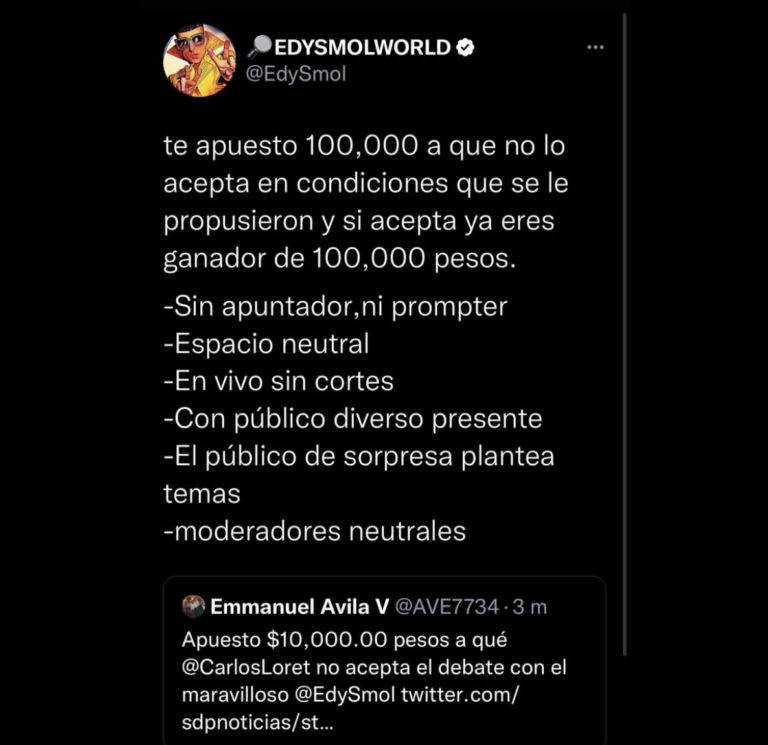 A través de redes sociales, Edy Smol puso sobre la mesa 100 mil pesos si es que Loret acepta el debate, esto tras la propuesta de un seguidor que le apostó 10 mil pesos a que el llamado en redes como #LordMontajes no debatirá.