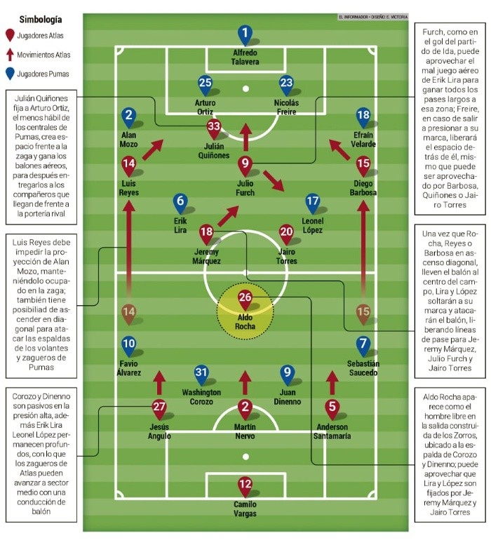 Atlas tiene la oportunidad de atacar de forma eficiente a los Pumas en la zona media del campo. Sea a ras de pasto o mediante pases largos. Se los explico.