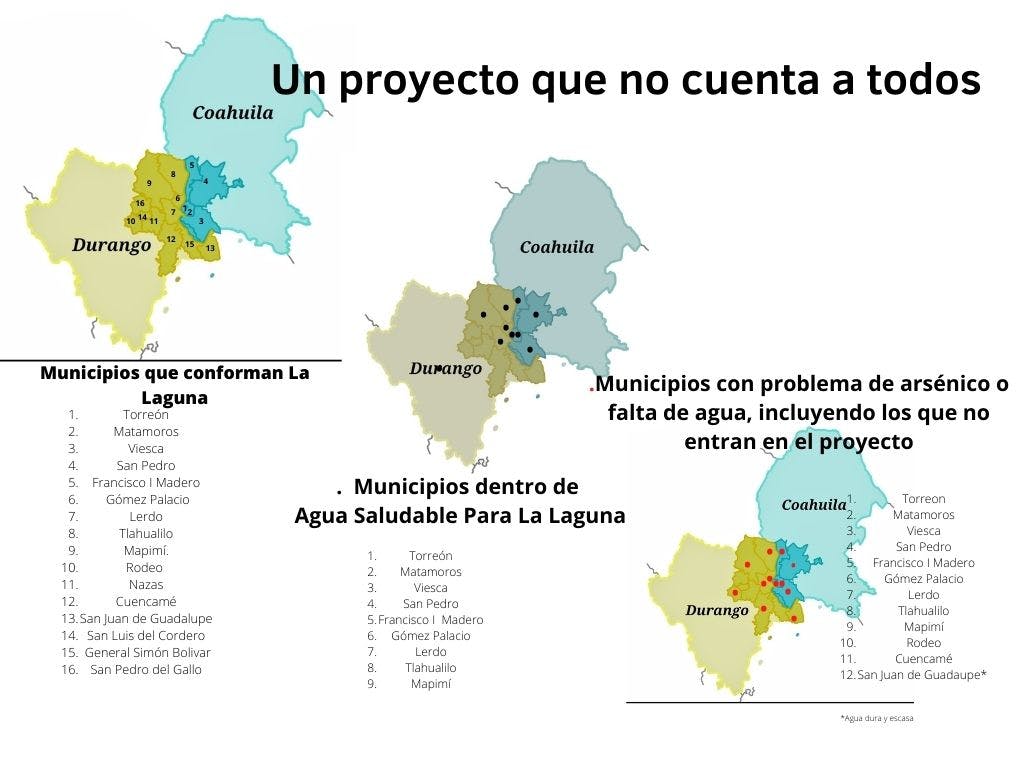A pesar de que los pozos 1 y 2 de Pedriceña, pertenecientes a Cuencamé, presentaban 0.0376 y 0.0333 miligramos de arsénico por litro de agua, cuando el nivel permitido es 0.025; el pozo 2 de Velardeña tenía 0.849; el 1 y el 4 de Cuencamé reportaban 0.0534 y 0.0485 respectivamente y el Rodeo 0.0426, no fueron incluidos en este proyecto, que es considerado uno de los más importantes del actual sexenio.