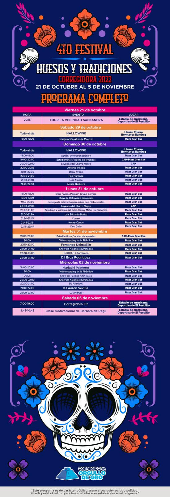 Corregidora, Qro., 16 de octubre de 2022.- El cuarto Festival Huesos y Tradiciones de Corregidora se celebrará del 21 de octubre al 5 de noviembre; durante el mismo, la Secretaría de Desarrollo Económico del municipio llevará a cabo eventos culturales, musicales y artísticos en la Plaza Gran Cué, en la Unidad Deportiva de El Pueblito y en el Lienzo Charro Hermanos Ramírez.