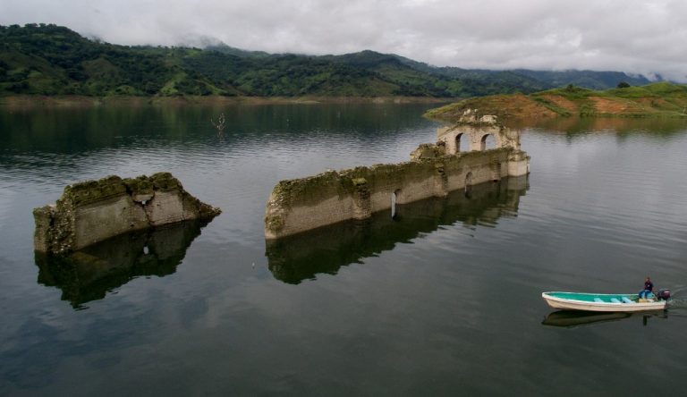 El templo de Quechula quedó completamente sumergido por el Río Grijalva, al sureste de México. Por la sequía extrema, hoy se puede visitar en canoa.