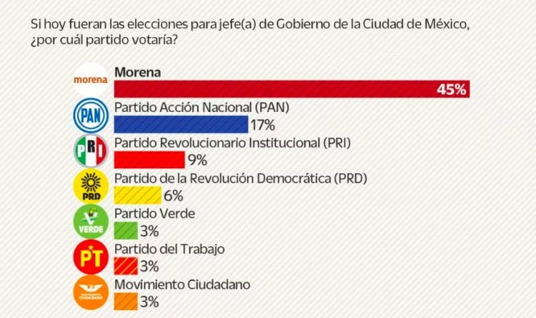 Una nueva encuesta publicada por El Universal, y realizada por la consultora Buendía y Márquez, indica que Morena tiene una intención de voto del 45% de las personas encuestadas. Esto refleja una apabullante ventaja de 28 puntos sobre su más cercano adversario, que, en este caso, sería el PAN, quienes cuentan con el 17% de la intención de voto de las personas encuestadas.