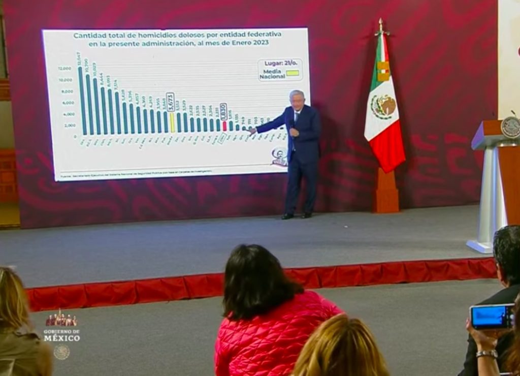 Ciudad de México, 24 de marzo de 2023.- En la conferencia matutina del gobierno federal de este viernes, el presidente Andrés Manuel López Obrador habló de la violencia en el país a partir de los datos de homicidios en las entidades federativas. Enfatizó que, en la media nacional de estos crímenes al mes de enero de 2023, Guanajuato se encuentra en primer lugar (por lo que sería la entidad más violenta), mientras que Querétaro está en los últimos lugares, aunque son estados vecinos.