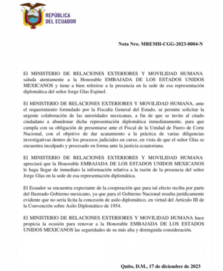 “Se permite solicitar la urgente colaboración de la representación diplomática inmediatamente, para que cumpla con su obligación presente ante el Fiscal de la Unidad de Fuero de Corte Nacional… en vista de que el señor Glas se encuentra inculpado y procesado en forma ante la justicia ecuatoriana”, apuntó el Ministerio.