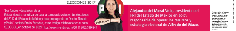 Por otra parte, de acuerdo con declaraciones de Emilio Zebadúa, ex oficial mayor de la SEDESOL en 2021 declaró ante un juez que los fondos desviados de la Estafa Maestra se usaron para propaganda de Osorio, Rosario y Peña Nieto, pero también en las elecciones del 2027 del Estado de México.