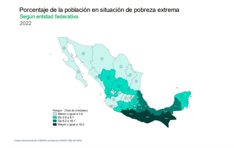 El porcentaje de la población en situación de pobreza extrema permaneció en niveles similares entre 2018 y 2022. Fue de 7.0 % en 2018 y de 7.1% en 2022. Lo anterior indica que el número de personas en pobreza extrema pasó de 8.7 millones a 9.1 millones entre 2018 y 2022.