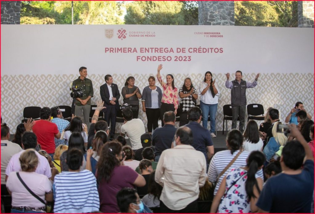 (03 DE MARZO, 2023).- La Jefa de Gobierno, Claudia Sheinbaum Pardo, encabezó la primera entrega de créditos del Fondo para el Desarrollo Social (FONDESO) 2023, por un monto de 45 millones 173 mil pesos, lo que representa 4 mil 621 créditos para personas emprendedoras de la Ciudad de México, recursos destinados a impulsar a Micro y Pequeñas Empresas, así como actividades productivas de autoempleo.