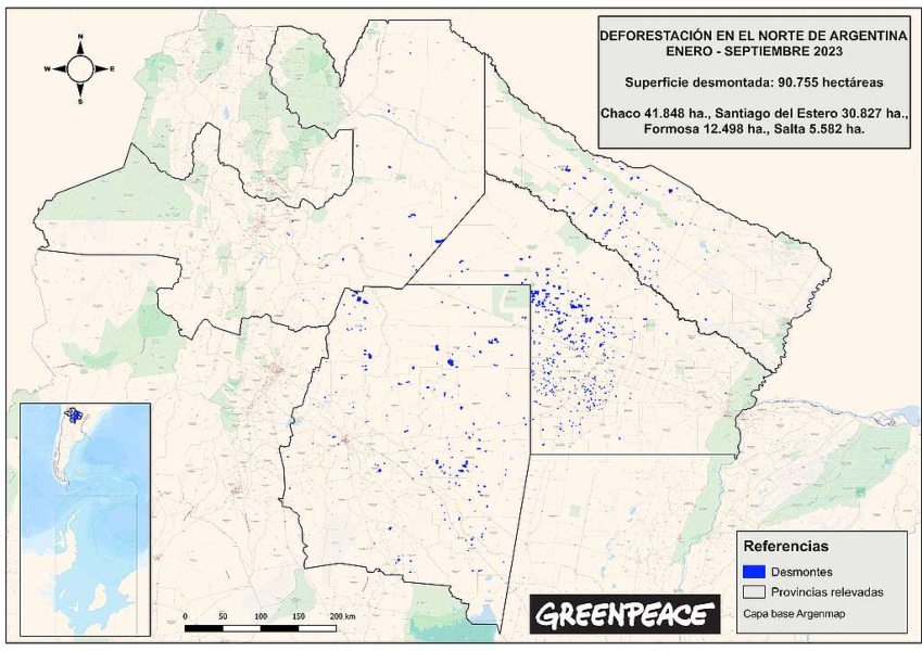 La organización ecologista Greenpeace relevó la deforestación en lo que va del 2023 en el norte de Argentina, a través de imágenes satelitales y descubrieron que fueron 90 755 hectáreas las afectadas por los desmontes, un 21% más que en el mismo período de 2022. La situación más grave está en el Gran Chaco argentino, especialmente, en Chaco y Santiago del Estero, donde casi todos los desmontes son ilegales.