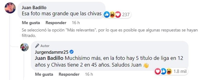 Fue ahí cuando un fanático le puso “Esa foto más grande que las Chivas”. Jürgen Damm no tuvo reparo alguno en seguir la broma y comentó: “Muchísimo más, en la foto hay 5 títulos de liga en 12 años y Chivas tiene 2 en 45 años. Saludos”.
