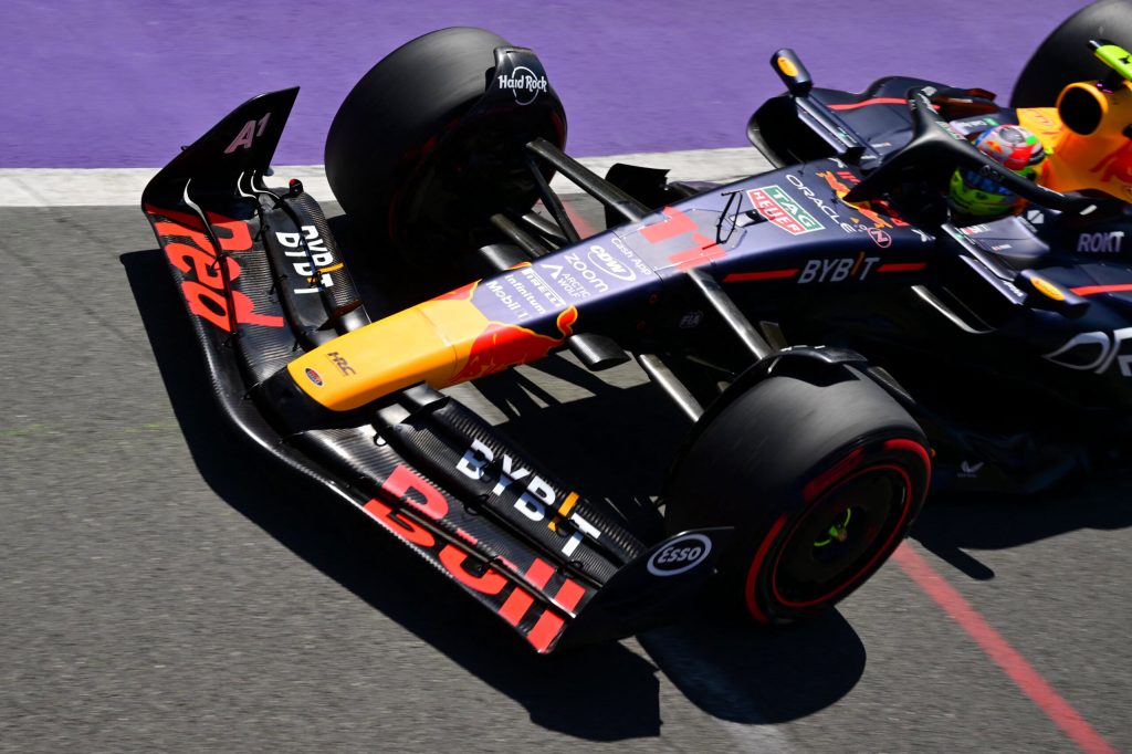 Para resaltar que el tapatío comenzó la prueba con rastrillos aerodinámicos en su RB19 para medir la presión y el flujo. Después ingresó al garaje, se hicieron otros ajustes y de nuevo regresó a pista pasados los 20 minutos de actividad.