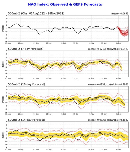 ¿Qué pasa ahora mismo (y en las próximas semanas)? Que tanto la OA como la NOA son (y serán) negativas: eso asegura una mayor probabilidad de recibir borrascas atlánticas y frentes fríos del norte. Evidentemente, eso no significa demasiado: el invierno en España depende de muchos factores y ninguno de estos es definitorio. Pero lo que sí es cierto es que la balanza probabilística está clara: podemos esperar frío y lluvia.