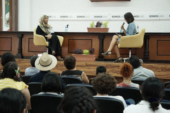 Querétaro, Qro., 2 de septiembre de 2022.- La población joven y las mujeres son elementos valiosos para cambiar la sociedad, aseguró la ganadora del premio Nobel Tawakkol Karman, en conversación con la periodista Lorena Alcalá Cabrera en la Universidad Autónoma de Querétaro (UAQ), en el marco del Hay Festival.