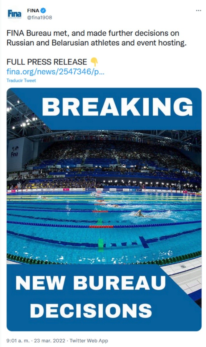 Este miércoles 23 de marzo, la Federación Internacional de Natación (FINA) anunció la exclusión de los nadadores rusos y bielorrusos, así como de todos sus funcionarios, para el próximo Mundial que se celebrará en Budapest entre el 18 de junio y el 3 de julio de 2022.