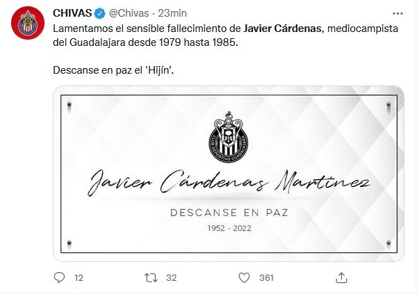 Este sábado, a la edad de 69 años, falleció el ex futbolista Javier Cárdenas, quien durante su carrera jugó para clubes como Chivas y Toluca.