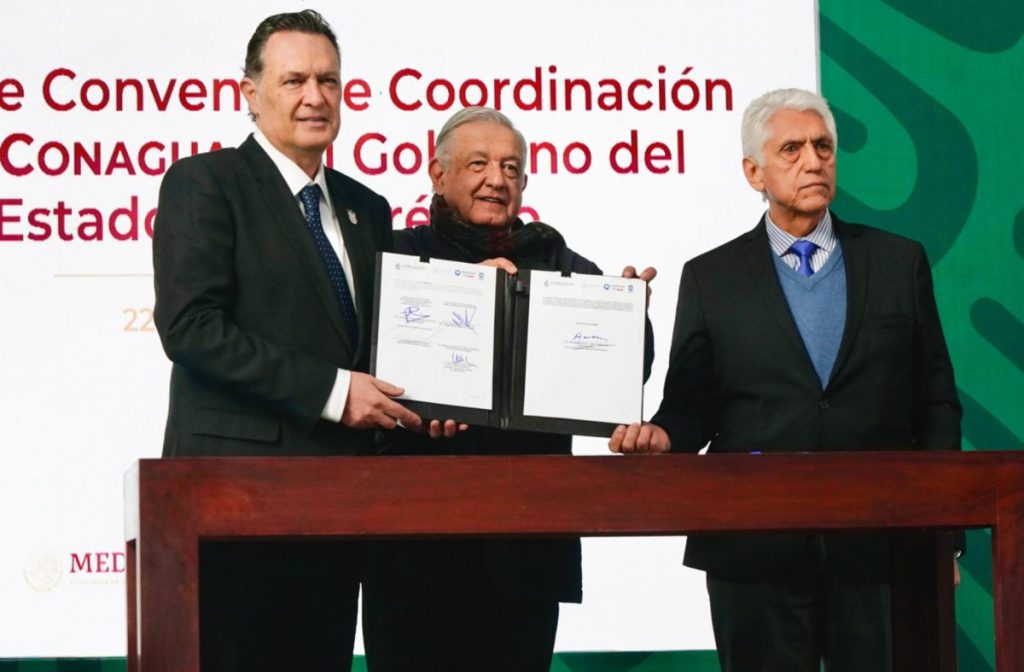 (22 DE ENERO, 2024).- Esta mañana, al encabezar la conferencia de prensa en Querétaro, el presidente Andrés Manuel López Obrador firmó como testigo de honor el convenio de coordinación entre el Gobierno de México, a través de la Comisión Nacional del Agua (Conagua), y el gobierno estatal a fin de garantizar el abasto de agua ante el actual crecimiento poblacional en la zona metropolitana de la entidad.
