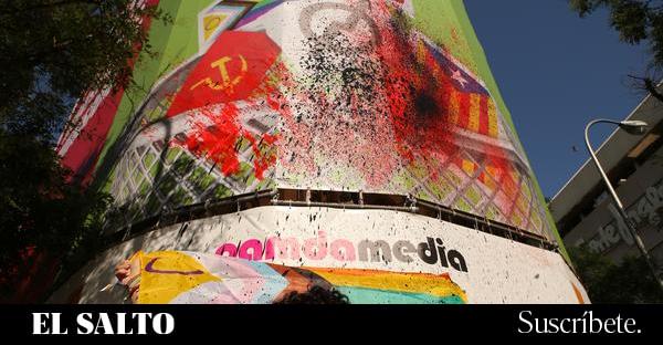 El colectivo Futuro Vegetal ha teñido esta mañana de rojo la pancarta gigante que Vox había colocado en el centro de Madrid y que lanza un mensaje contra el feminismo, las personas LGTBIQA+ o el independentismos catalán.