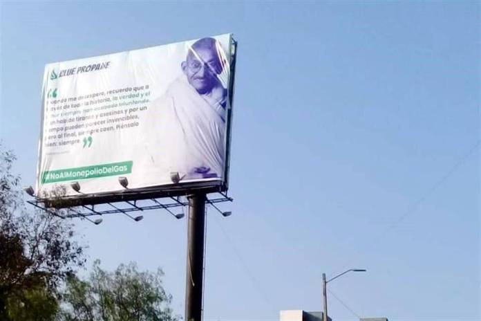 El espectacular tenía el logo de la gasera Blue Propane y una imagen de Mahatma Gandhi y Benito Juárez; así como, de la leyenda #NoAlMonopolioDelGas.