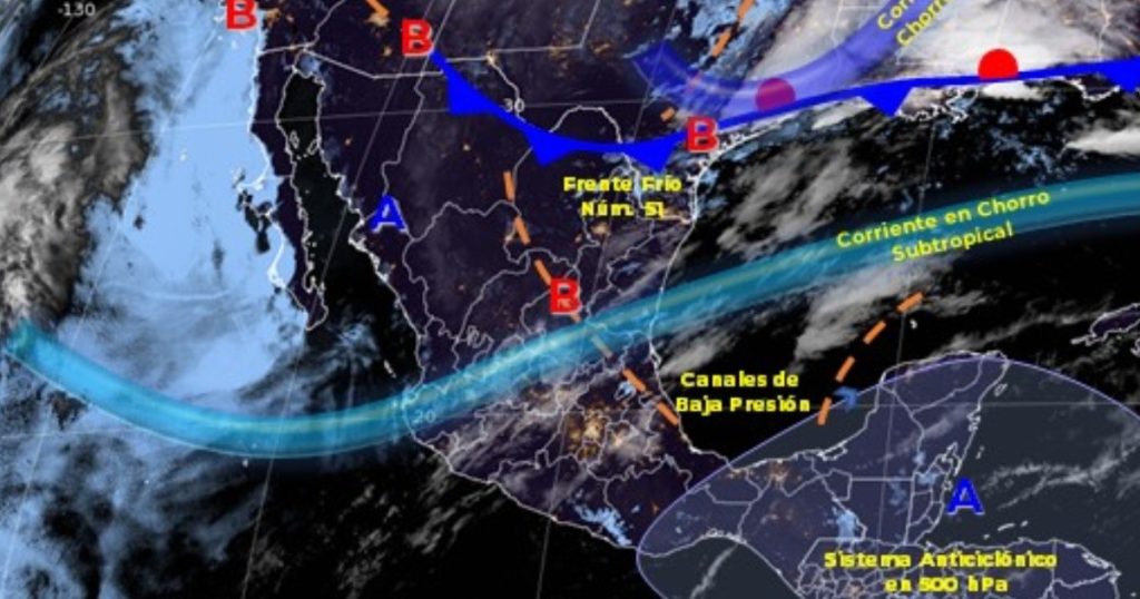 Por otra parte, el frente frío núm. 51 se localizará sobre el Noreste del País, interaccionará con un canal de baja presión que se establecerá sobre el Oriente de México y con la corriente en chorro subtropical, originando lluvias y chubascos en el Noreste, Oriente y Centro del territorio nacional, además de lluvias puntuales fuertes en Nuevo León, Tamaulipas, San Luis Potosí, Puebla y Veracruz.