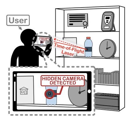En la aplicación iríamos enfocando los rincones de una habitación en la que sospechamos que hay una cámara oculta, y una interfaz de realidad aumentada nos indicaría dónde está. No haría falta ningún equipo ni dispositivo especial, como ocurre con otros métodos. Con un smartphone moderno y sus sensores ToF bastaría.