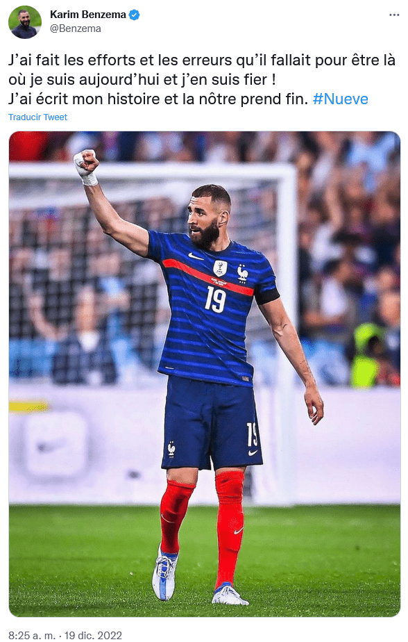 «He realizado los esfuerzos y he cometido los errores necesarios para estar donde estoy actualmente y estoy orgulloso de ello. He escrito mi historia y la nuestra finaliza», escribió en Twitter el Balón de Oro de 2022, que cumple 35 años este lunes, acompañando su mensaje de una foto suya con la camiseta de la Selección de Francia.