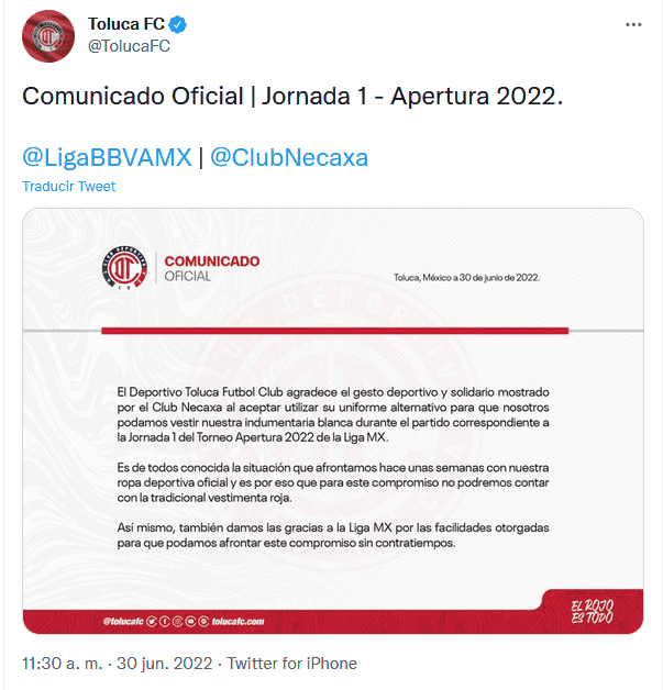 En un comunicado, el Toluca agradeció a su rival por el gesto. «El Deportivo Toluca Futbol Club agradece el gesto deportivo y solidario mostrado por el Club Necaxa al aceptar utilizar su uniforme alternativo para que nosotros podamos vestir nuestra indumentaria blanca durante el partido correspondiente a la Jornada 1 del Torneo Apertura 2022 de la Liga MX», dice el texto publicado en redes sociales.