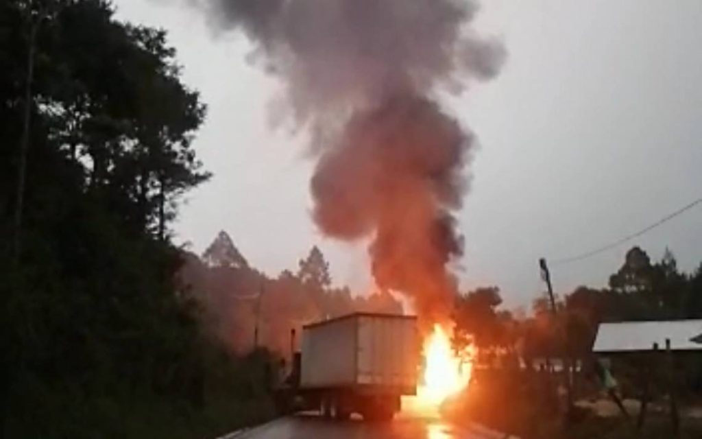 Indígenas incendian tráiler sobre carretera San Cristóbal-Ocosingo, Chiapas