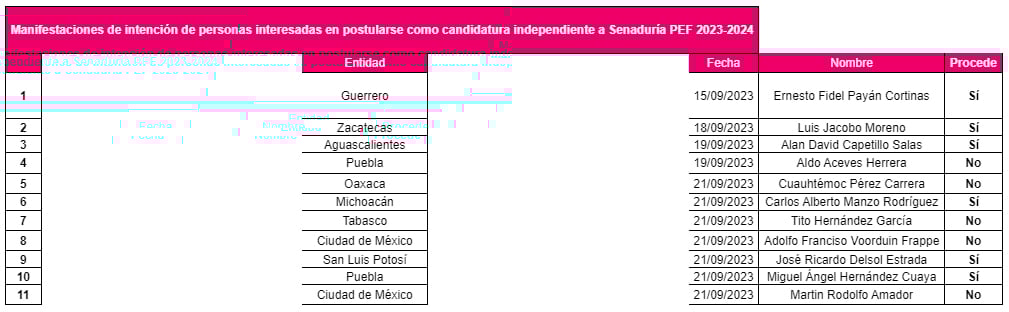 De acuerdo con la convocatoria, el pasado 21 de septiembre concluyó el plazo para que las ciudadanas y los ciudadanos interesados en postularse a una candidatura independiente al cargo de una senaduría manifestaran su intención ante las Juntas Locales Ejecutivas.